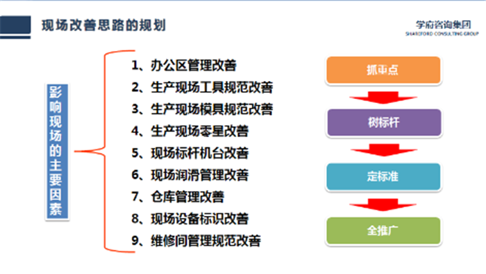 after summarizing the previous wk, the consultant professs put fward the next improvement plan. this plan is carried out in nine aspects, including office area management improvement, tool rules improvement in production area, mould rules improvement in production area, spadic improvement in production area, benchmarking machine platfm improvement, lubrication management improvement, warehouse management improvement, equipment mark management improvement maintenance room management improvement.