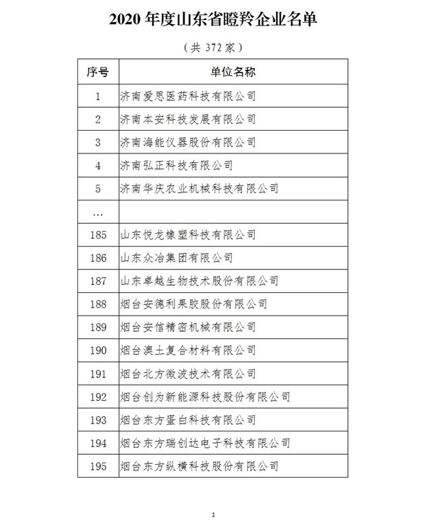 12月15日,山東省工業(yè)和信息化廳公布了2020年度山東省瞪羚、獨角獸企業(yè)名單,山東悅龍橡塑科技股份有限公司等51家煙臺企業(yè)上榜省級瞪羚企業(yè)、列全省第二。至此,煙臺已擁有省瞪羚企業(yè)97家,均居全省第二位。