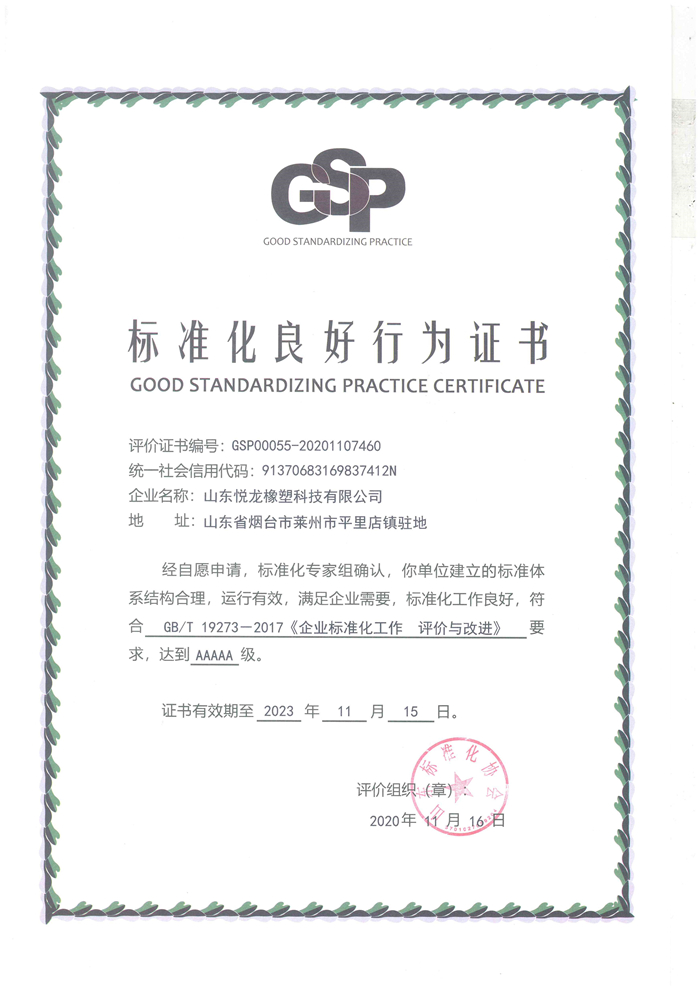 山東悅龍橡塑科技股份有限公司在標(biāo)準(zhǔn)工作重視程度、標(biāo)準(zhǔn)體系建設(shè)、技術(shù)成果轉(zhuǎn)化、參與國(guó)內(nèi)標(biāo)準(zhǔn)化活動(dòng)等方面均表現(xiàn)突出,起到了良好的示范作用。標(biāo)準(zhǔn)化是企業(yè)技術(shù)創(chuàng)新的重要基礎(chǔ),技術(shù)標(biāo)準(zhǔn)化是標(biāo)準(zhǔn)化工作的核心。基于對(duì)標(biāo)準(zhǔn)化工作的重視,山東悅龍橡塑科技股份有限公司在相關(guān)領(lǐng)域也取得了亮眼的成績(jī)。