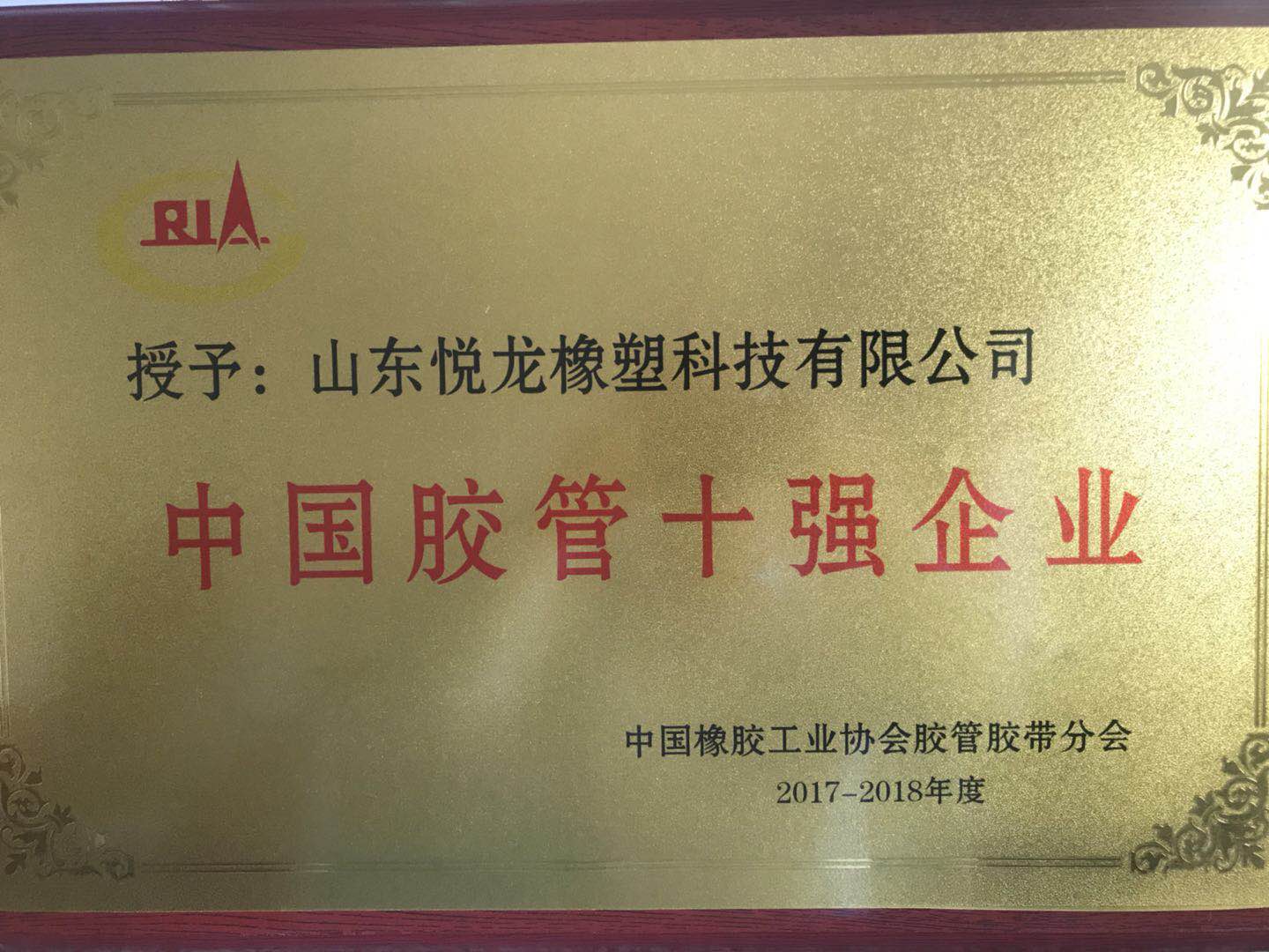 山東悅龍橡塑科技股份有限公司榮獲2018年度“中國(guó)膠管十強(qiáng)”