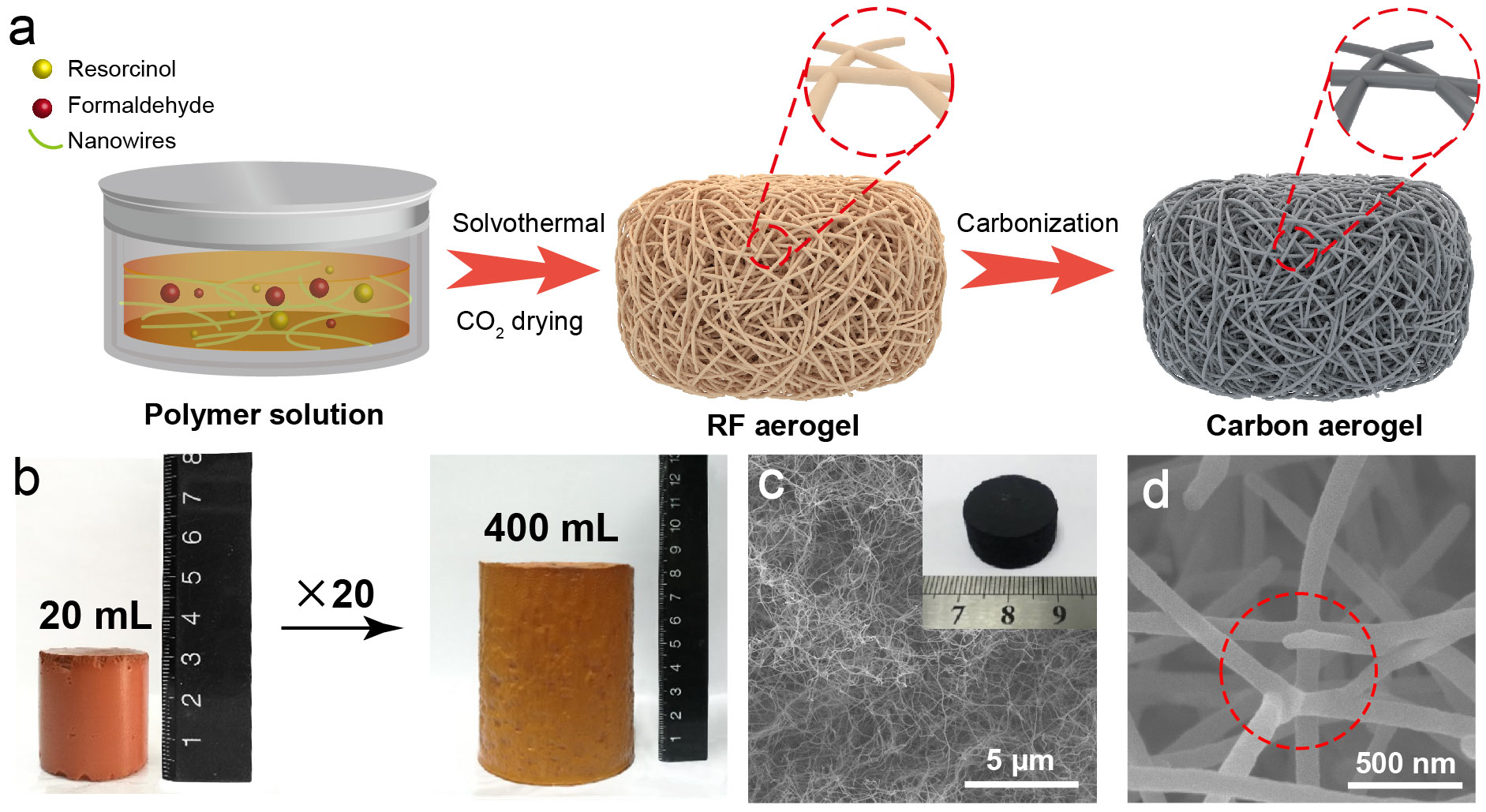 (a)示意圖,表明通過使用納米線作為模板的通用合成方法;(b)以BCNF@RF為例,宏量合成RF納米纖維水凝膠;(c)硬碳?xì)饽zSEM圖像;(d)顯示納米纖維網(wǎng)狀結(jié)構(gòu)和纖維-纖維的焊接點(diǎn)。