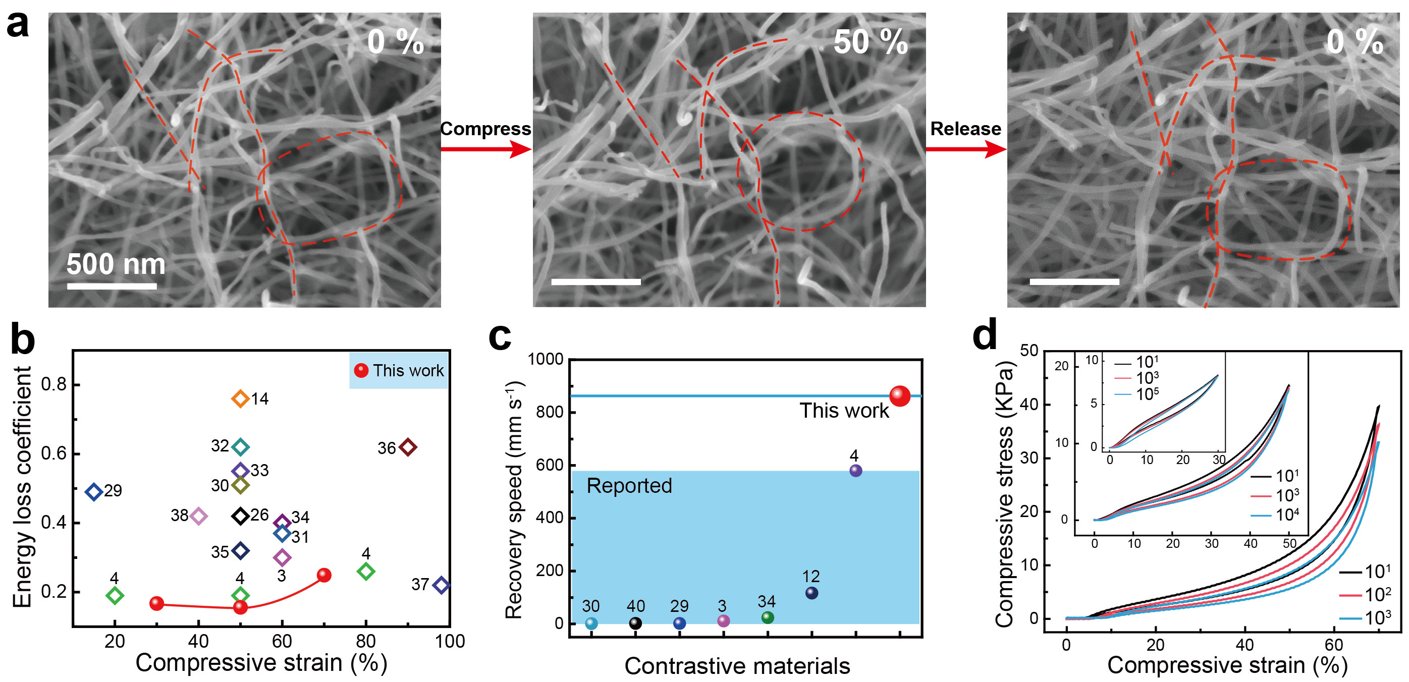 (a)BCNF@C氣凝膠的原位SEM;(b)不同材料能量損耗系數(shù)的對(duì)比;(c)不同材料回彈速度的對(duì)比;(d)碳?xì)饽z不同循環(huán)下的應(yīng)力-應(yīng)變曲線